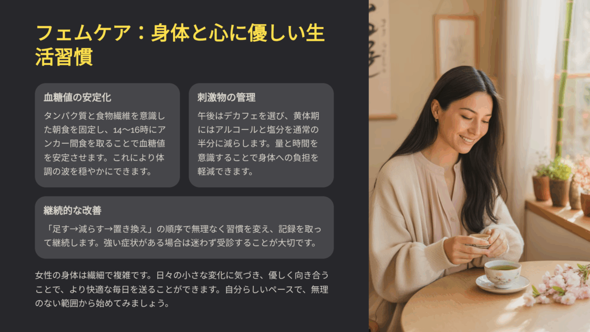 カフェインは午前1〜2杯まで、アルコールは黄体期“半分ルール”。塩分は汁物1杯・ドレッシング別添。 - ③ 足りない栄養を先に足す