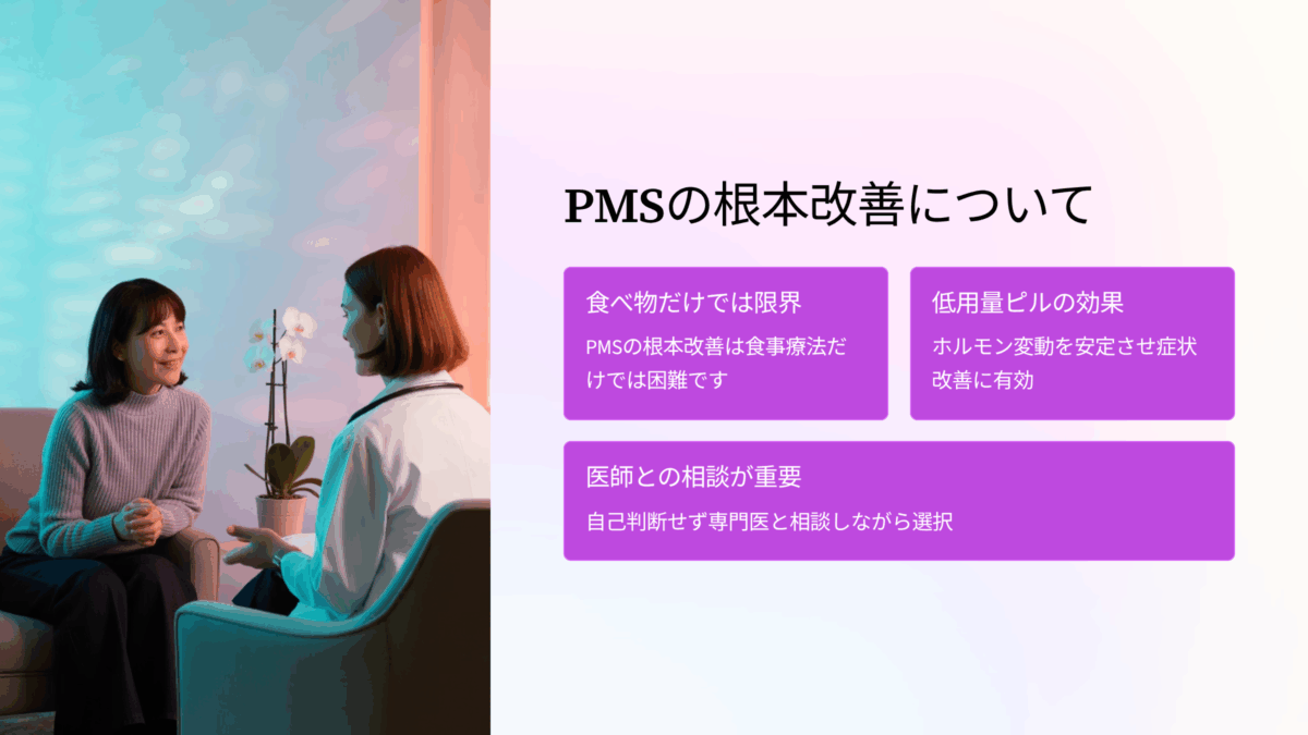 私自身は、食事療法を続けても改善しない症状があり、ピルを取り入れることでようやく心身の安定を感じられるようになりました。ただし、これはあくまで私のケース。人によっては食事で十分に改善する方もいます。